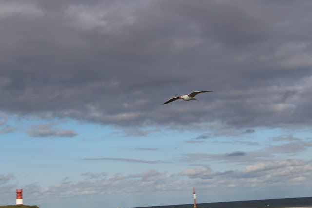 Wir sind dann erstmal eine Weile in der Hütte geblieben und haben uns aufgewärmt. Am Abend wollten wir noch ein Spaziergang machen. Kaum kamen wir aus der Hütte, spürte ich einen leichten Flügelschlag auf der Schulter und blitzschnell stürzte sich eine Möwe auf das Stück Brot, das mein Schatz in der Hand hatte :D Möwen füttern ist auf Helgoland ja per Geldstrafe verboten- ein bissi spät, anscheinend. Wenn man was zu Essen in der Hand hat, sollte man sich vorsehen. Die Begegnung mit eben dieser Möwe sollte nicht unsere letzte sein.
